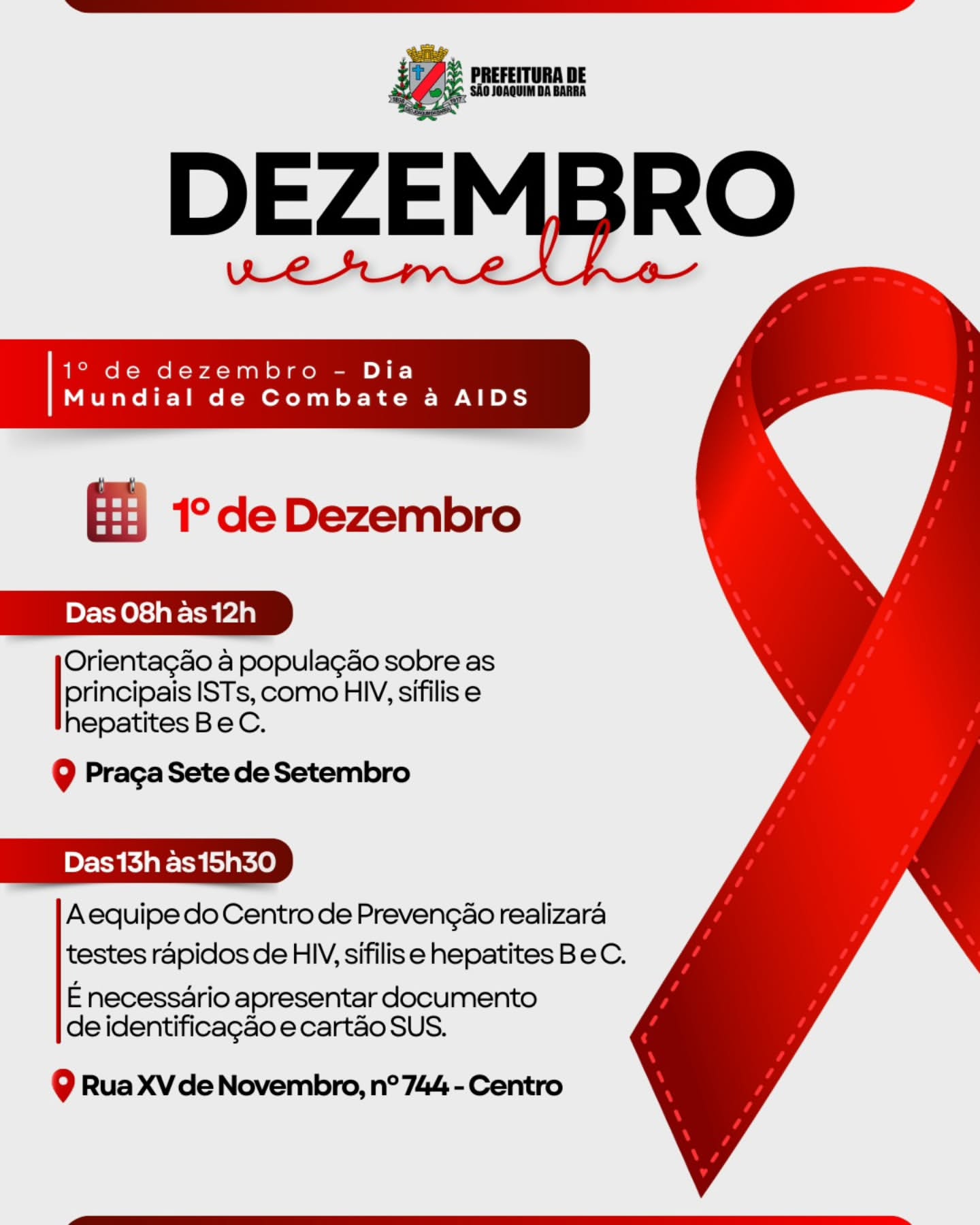 Na parte da manhã, das 09h às 12h, a equipe da ESF Central e do Centro de Prevenção estarão na Praça Sete de Setembro, orientando a população sobre as principais ISTs, como HIV, Sífilis, Hepatite B e Hepatite C.